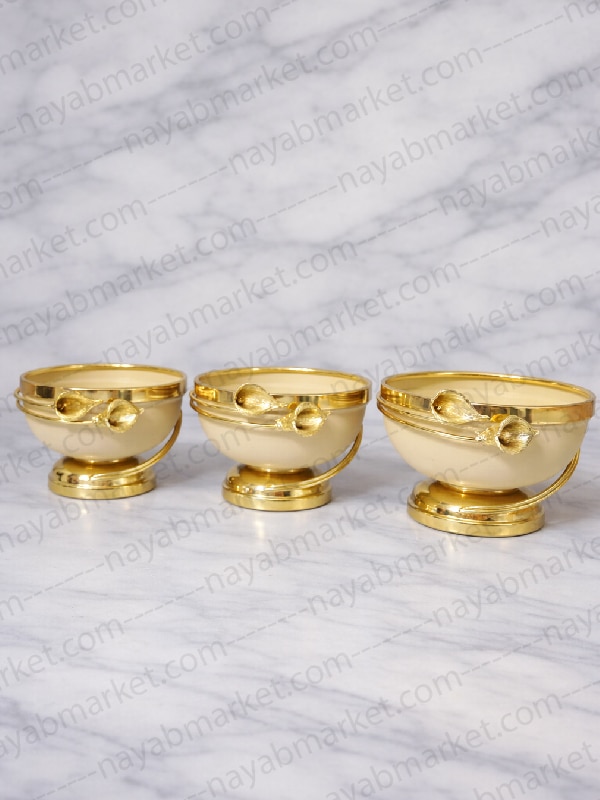 • شیرینی خوری: قطر ۳۰، ارتفاع ۱۰ • آجیل خوری: قطر ۲۲، ارتفاع ۱۴.۵ • شکلات خوری: قطر ۱۹، ارتفاع ۱۳ • اردو خوری سه پیاله با دسته: قطر هر پیاله ۱۰، ارتفاع با دسته ۳۰ |